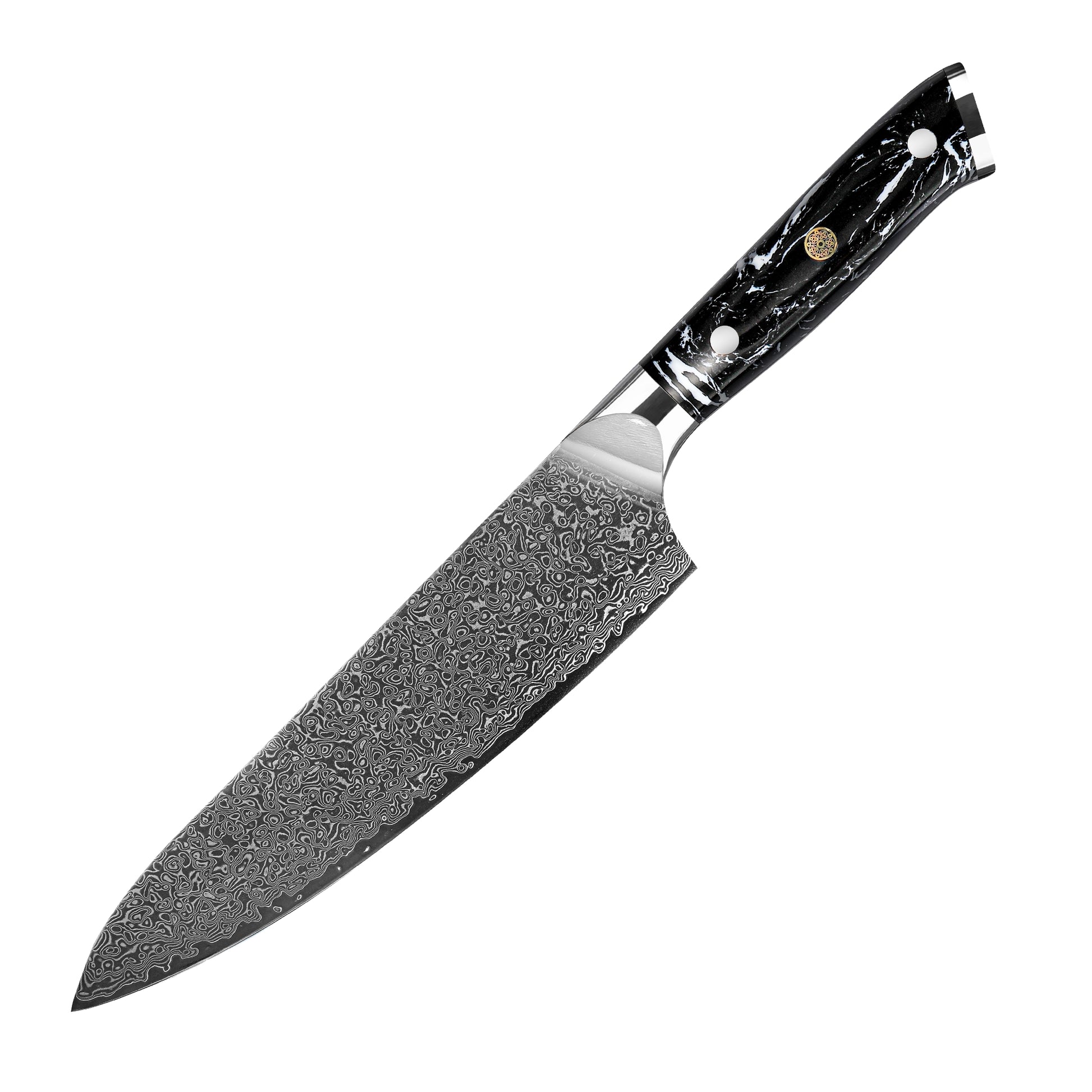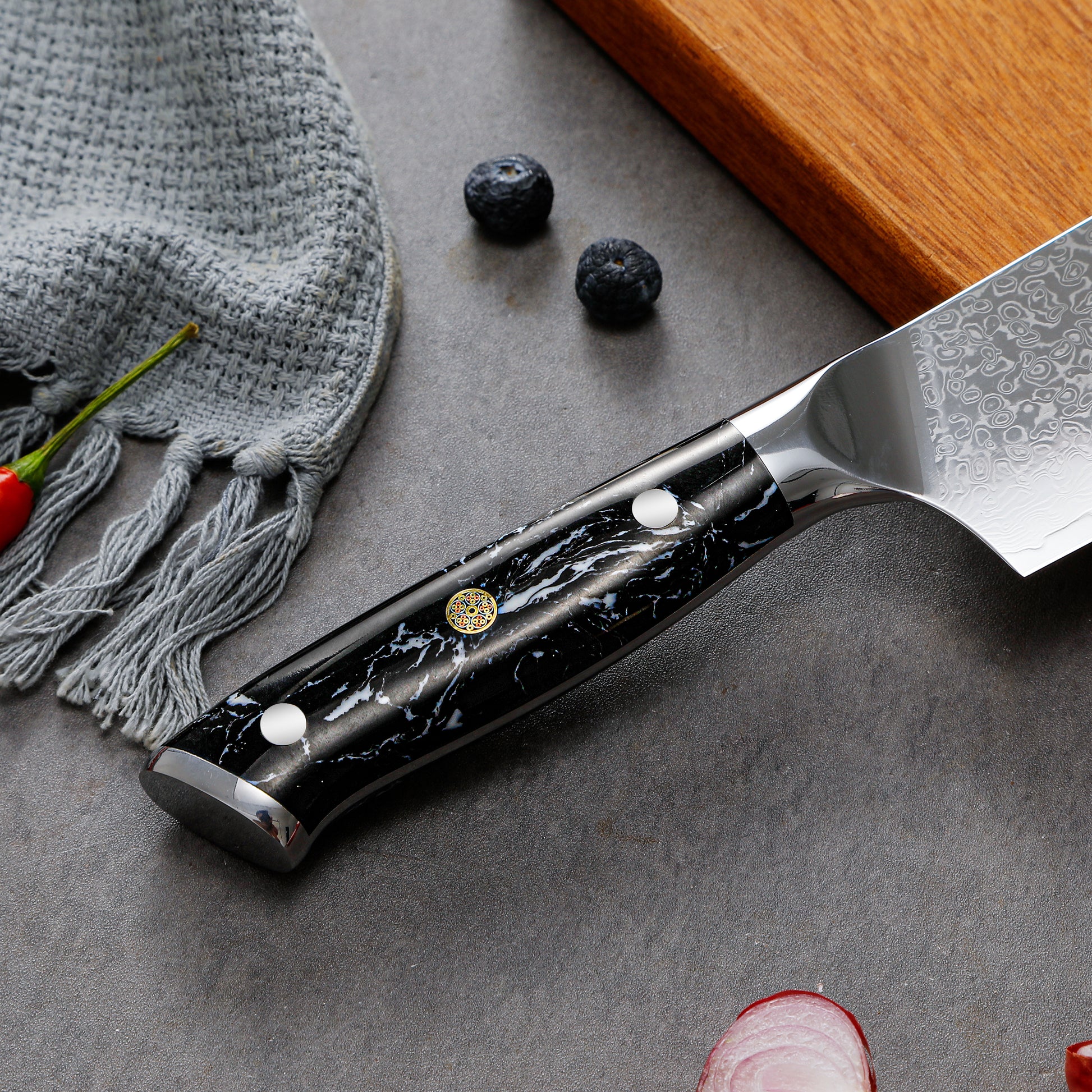 A Damascus séfkés egyedi megjelenését és teljesítményét a 67 rétegű, kézzel kovácsolt VG10 acélmag adja.